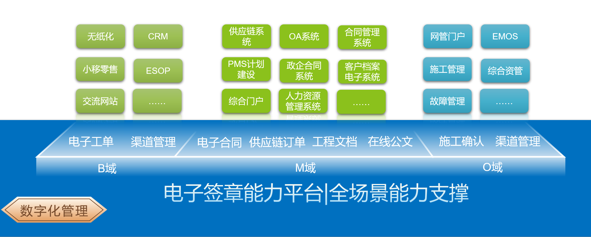 提供签章共性能力,以用户感知为抓手,赋能企业数字化管理,多方位支持企业运营,利用电子签章能力推动企业数字经济支撑B域、M域、O域多业务系统在线办理,实现供应商电子招投标、供应链订单、电子工单、电子合同、在线公文等线上签约。